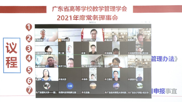 本网讯 8月20日,广东省高等学校教学管理学会(以下简称学会)召开2021年度第一次常务理事线上会议。学会常务理事及相关工作人员参加了会议。会议由我校副校长、学会会长郑文主持。