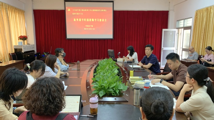 本网讯 10月11日下午,外国语学院教工党支部在学院会议室召开全院港澳台及海外留学归国教师(以下称海归教师)学习座谈会,深入学习和贯彻《习近平给全国高校黄大年式教师团队代表重要回信精神》,共同学习黄大年同志先进事迹。外国语学院留学或进修于美国、英国、日本、法国、香港、澳门、台湾等地的优秀海归教师代表等共20余人参加了座谈会。座谈会由外国语学院教工党支部书记、副院长康传金主持。