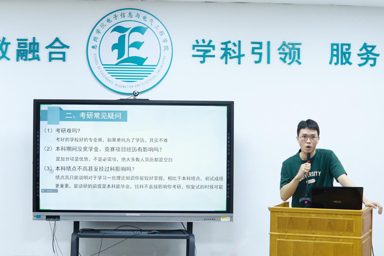受邀参加本次分享会并先后发言的学生有18电信1班柳剑锋(考取湖南师范大学)、18电信工程2班夏文涛(考取汕头大学)、18电气4班官依良(考取广东工业大学)、18材料1班林坚锋(考取广东工业大学)、18物理学1班张洁婷(考取广州大学)、18机电1班吴加豪(考取西南科技大学)等6位同学。他们从各自的考研动机、学习方法、择校经验、资料准备、时间安排、计划制定等方面,向同学们分享了自己的成功经验。大家一致认为,备战考研要加强专业知识学习,夯实公共学科基础,加强时事政治的学习,丰富英语阅读能力。同时,还强调了保持良好心态对于考研的重要性。