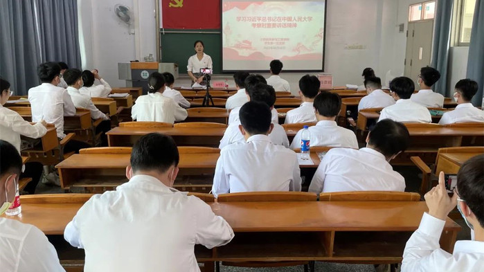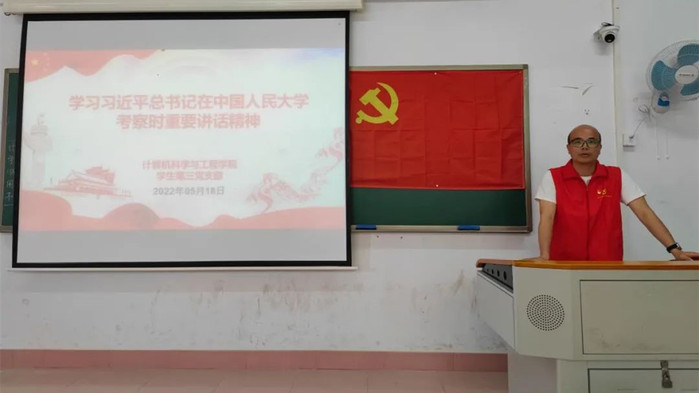 在电子楼404教室,计算机科学与工程学院学生第一党支部书记陈珊珊以“学习习近平总书记在中国人民大学考察时重要讲话精神”为题进行授课。她希望全体青年党员要牢记习近平总书记的殷切嘱托,牢记党的教诲,立志民族复兴,不负历史、不负时代、不负人民,在青春的赛道上奋力奔跑,争取跑出当代青年的最好成绩!