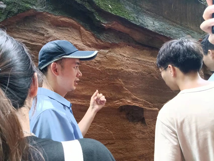 5月29日,在丹霞山景区,带队老师向同学们讲解丹霞地貌和砂岩砾岩的特征及成因,加深了同学们对丹霞山生物多样性、地貌演化的认识,强化了户外考察罗盘的使用方法。