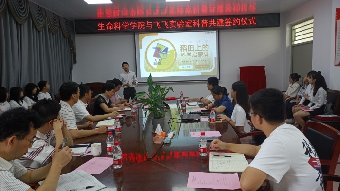 本网讯 6月17日上午,生命科学学院与飞飞实验室共建科普实验室签约仪式在化工楼E409会议室举行。2018届校友、飞飞实验室创始人吴志鑫及其团队,校团委书记赖昭华,学院党政班子及其教师代表参加了共建实验室签约仪式。仪式由学院党总支副书记潘勇裕主持。
