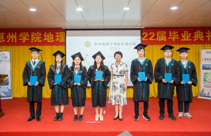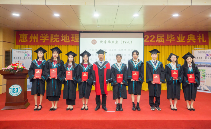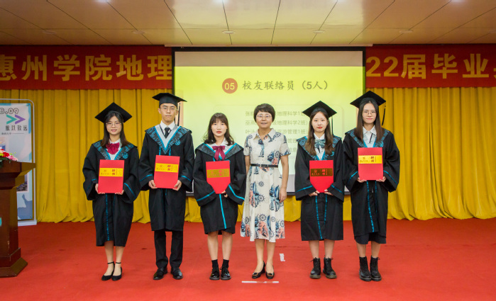 因入伍、工作、抗洪等原因无法出席本次典礼的黄楚玲、禤家宝、马乔仪等同学通过录制视频的形式表达了地理与旅游学院大学四年培养的感激之情及对同学们的祝福。随后全体人员一同唱响惠州学院校歌《奔向未来》,为2022届毕业生在惠州学院美好的学习生活划上了圆满的句号。