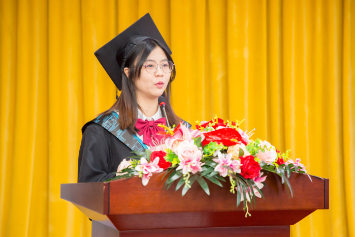 仪式前,参会人员全体起立,全体师生奏唱中华人民共和国唱国歌,用嘹亮的歌声表达对祖国的无限热爱。随后,师生一同通过视频回顾了2022届毕业生在母校的大学四年的青春岁月。一首由师弟师妹合唱的《凤凰花开的路口》,点燃了毕业典礼的现场气氛,毕业生们潸然泪下。在发言环节,2022届优秀毕业生、校友联络员代表张晓倩发言,她总结了四年来的求学经历,表达对老师、同学的感激之情和不舍之情,并为四年同窗同学送上真挚的祝福。