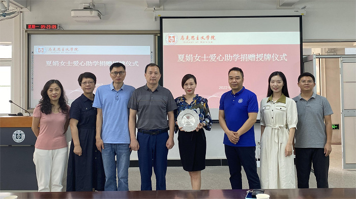 本网讯 近日,马克思主义学院在旭日大楼228会议室举行夏娟女士爱心助学捐赠授牌仪式,院长林清明、党总支书记游少华、副书记杨倩、副院长郑广祥、挂职副院长肖莉丹、思政导师李楠及受助学生代表卢丽璇参加仪式。
