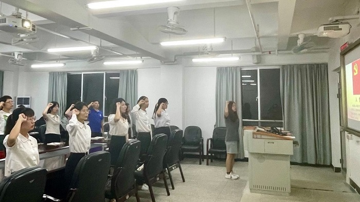 活动上,肖文政老师就“政治生日”的含义及其意义作了阐述,他强调各位党员要强化宗旨意识和责任意识,时刻牢记党员“第一身份”,切实发挥先锋模范作用。随后,全体党员共同观看了“丹心一片风华百年——听老党员讲那过去的故事”系列微视频,紧接着全体党员面向鲜红的党旗,共同宣誓,回忆入党过程,重温入党初心。