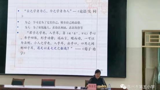 本网讯 7月6日下午,惠州市第五小学举行了“学《论语》,修师德”培训活动,文学与传媒学院陈金花副教授应邀授课。本次讲座由吴燕君校长主持,五小全体教职员工参加。