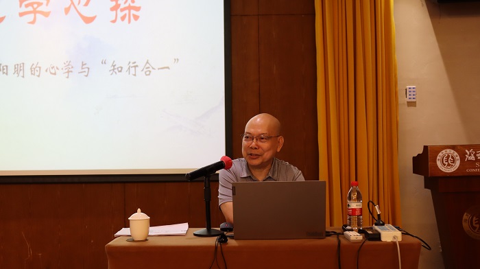 7月12日上午,关建人先生以《心学新探——王阳明哲学思想分析》为主题,阐述了王阳明哲学思想的起源、发展、集大成的历史脉络,并结合自身经历,重点对王阳明学说的核心“知行合一”进行生活化的解释。关建人先生的分享对如何做好一名思政课教师提供了启发,要求思政课教师应该像王阳明那样“诚意正心”、“知行合一”。