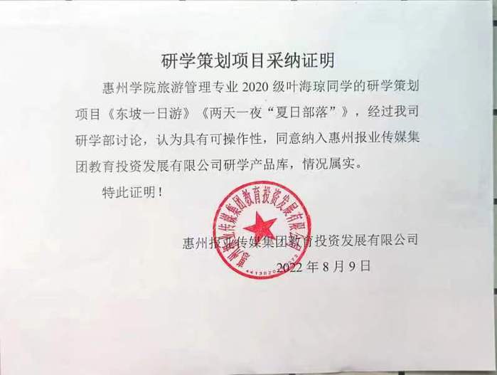 本网讯 近日,接惠州报业传媒集团教育发展有限公司通知,经该公司研学部讨论,地理与旅游学院旅游管理专业2020级范东燕、叶海琼两位同学设计的研学项目《东坡一日游》《夏日部落》已纳入该公司研学产品库。