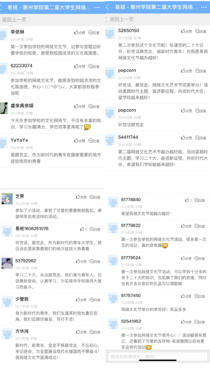 本次成果展现场设置了“学习二十大 永远跟党走”主题知识竞答区、惠院易班建设成果展、惠州学院“易传承”网络文化工作室介绍和网络文化优秀作品展四大展区。
