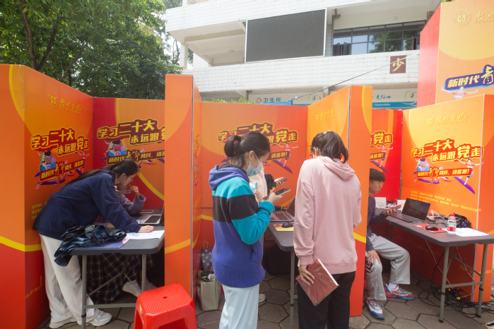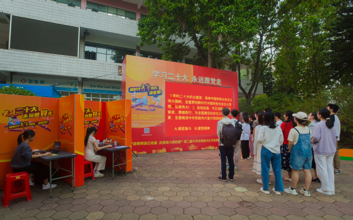 在“学习二十大 永远跟党走”主题知识竞答专区,现场轮番播放党的二十大精神学习视频,学生通过观看视频的方式学习党的二十大精神,深刻领悟“两个确立”的决定性意义,切实增强“四个意识”、坚定“四个自信”。同学们通过学习前往答题专区参加在线考试,进一步检验学习成效。