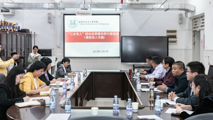 本网讯 11月3日下午,学校“三全育人”综合改革建设(课程育人专题)研讨推进会在建筑与土木工程学院会议室召开。党委宣传部、教务处、党委组织部有关负责人,建筑与土木工程学院领导班子、教师代表参加会议。会议由建筑与土木工程学院党总支书记王精明主持。
