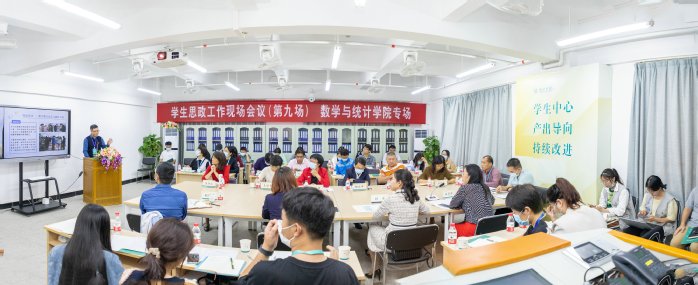 本网讯 11月25日下午,我校在数学与统计学院召开第九场学生思政工作现场会议,围绕学术科技类社团育人功能的提升路径展开研讨。学校党委副书记车小真,学生处、团委负责人,数学与统计学院党政主要负责人,各二级学院党总支副书记、辅导员代表,学生处、团委有关人员参加会议。会议由学生处相关负责人主持。