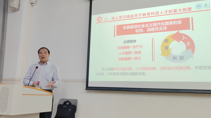 许玩宏以“践行二十大,做新时代先锋”为主题,分别从党的二十大精神的核心要义和丰富内涵、深入学习党的二十大报告中关于教育、科技、人才的重要部署、以党的自我革命引领伟大的社会革命等方面进行宣讲。他指出,党的二十大是一次高举旗帜、凝聚力量、团结奋进的大会。学习好、宣传好、贯彻好党的二十大精神,对于团结和激励全党全国各族人民坚持和发展中国特色社会主义、全面建设社会主义现代化国家、全面推进中华民族伟大复兴具有重大现实意义和深远意义。加快建设教育强国、科技强国、人才强国,就需要坚持为党育人、为国育才,全面贯彻党的教育方针,落实立德树人根本任务,培养德智体美劳全面发展的社会主义建设者和接班人,进一步提高全民族综合素质,并在此基础上全面提高人才培养质量,着力造就拔尖创新人才,强化现代化建设人才支撑。