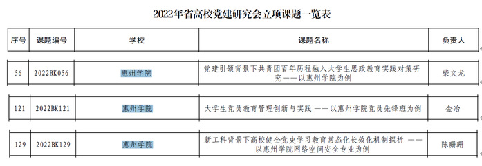 本网讯 近日,广东省高校党建研究会公布2022年党建课题立项名单。经个人申报、学校推荐、广东省高校党建研究会组织专家评审等环节,我校党办、校办、校友办(合署)柴文龙老师主持的《党建引领背景下共青团百年历程融入大学生思政教育实践对策研究——以惠州学院为例》、党委组织部金冶老师主持的《大学生党员教育管理创新与实践——以惠州学院党员先锋班为例》和计算机科学与工程学院陈珊珊老师主持的《新工科背景下高校健全党史学习教育常态化长效化机制探析——以惠州学院网络空间安全专业为例》等3个党建课题获批立项。