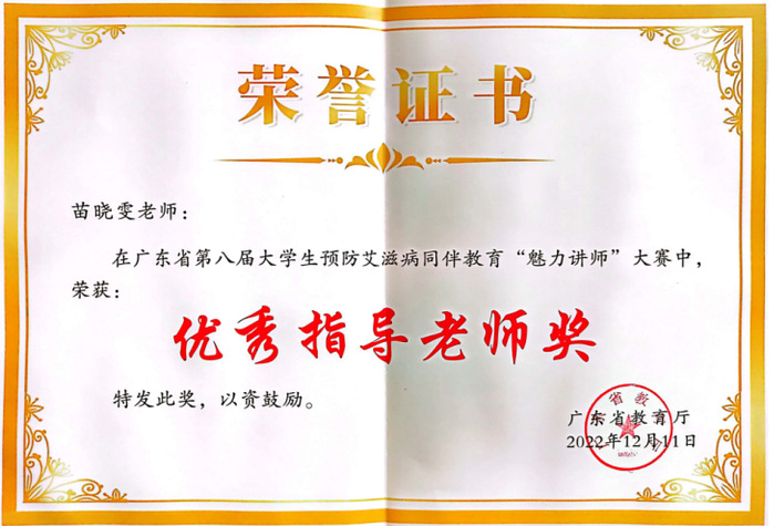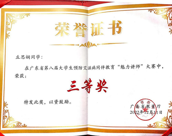 本网讯 近日,广东省第八届大学生预防艾滋病同伴教育“魅力讲师”大赛结果公布,我校外国语学院2020级英语2班丘思娴同学经过校赛和省赛筛选,顺利跻身11名决赛选手之列并获三等奖。心理健康教育与咨询中心苗晓雯老师获“优秀指导老师”称号,我校获“最佳组织奖”。