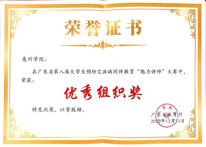 第八届大学生预防艾滋病同伴教育“魅力讲师”大赛由广东省教育厅主办,华南农业大学承办,全省高校推选两百多名大学生参赛。我校高度重视参赛组织,自2022年4月便在校内进行宣传、推广及校内预选赛,经过层层筛选和激烈角逐,2020级英语2班丘思娴以校赛第一名的成绩挺进省赛。在赛前准备阶段,丘思娴同学选取“性病-梅毒”科普为授课内容,从名人故事出发,结合科学调查数据,对梅毒的传播途径及预防方法进行了细致讲解,其幽默风趣又富含深意的授课风格获得省赛评委的一致好评。