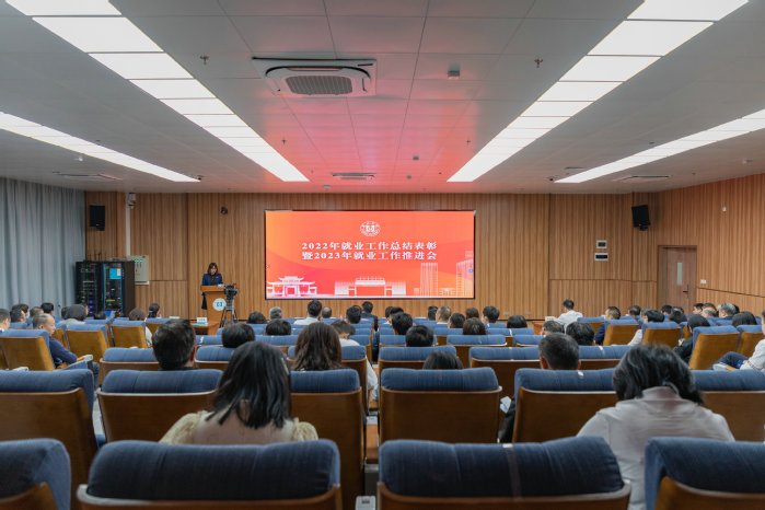 会议伊始,短视频《攻坚克难促就业 筑梦青春向未来》全面总结了我校2022年毕业生就业工作整体情况。