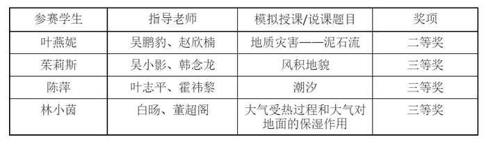 本网讯 近日,广东省第十届本科高校师范生(地理组)教师技能大赛结果公布,我校2019级地理科学(师范)专业叶燕妮、陈萍、林小茵、朱莉斯4名同学荣获二等奖1项、三等奖3项的好成绩。