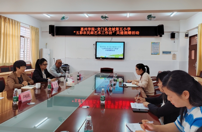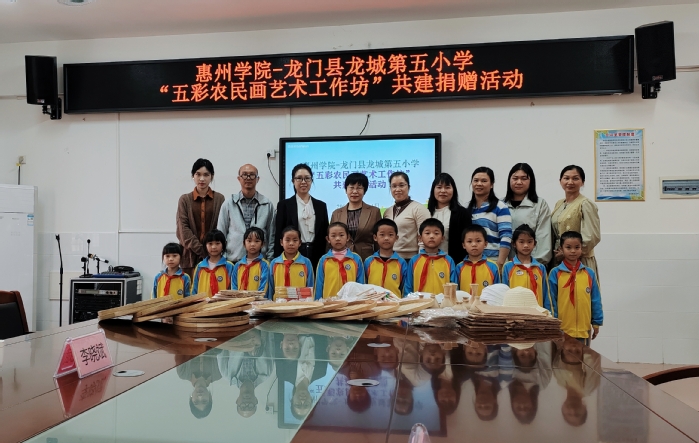 龙城第五小美术教师代表展示了近年来五彩农民画艺术工作坊农民画美育成果,在热烈的掌声中,惠州学院向龙门县龙城第五小学捐赠了一批艺术教育物资,包括绘画器材、颜料等。在日后的工作中,两校将继续共建工作坊,培养孩子们的艺术才能和创造力,感受传承之光、星火相传——曾经在龙门龙城第五小学播下的种子,如今开了花,并将继续绽放。
