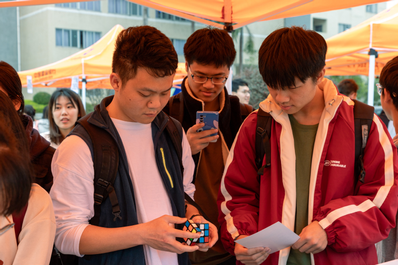 趣味数学活动在旭日广场热烈举行。本次活动内容包括数字华容道、趣味魔方、快乐数独、速算24点、五子棋,同时还有数学魔术游戏“偷心魔法”等。活动吸引了来自全校各学院五百多位学生参加,同学们在游戏中体验了数学之用、数学之趣、数学之美和数学之妙。