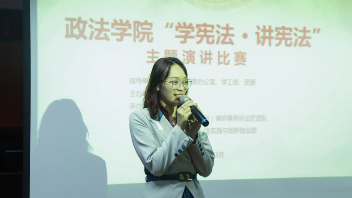 陈新华开场致词。她提到,宪法演讲活动目的在于传播宪法,也是学生培养敢说、会辩、善于思考能力的重要实践活动,她鼓励参赛学生无论结果如何,都要展现出自己的风采,展现出“长江后浪推前浪”的气势。邓婉婷也在致词中表示了对精彩表现的期待。