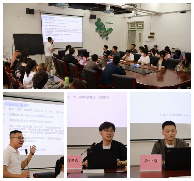 本网讯 为深化旅游管理专业学生的专业的认知,为其未来就业创业之路铺设基石,3月27日下午,学院在旭日科技大楼B1409会议室举办了旅游管理专业教育暨优秀校友就业创业沙龙活动。活动特邀旅游管理专业2019届毕业生刘鸿武(现欣旺达电动汽车电池有限公司HRBP)、李文杰(现惠州市智汇营销策划有限公司创始人)及2021届毕业生金小哲(现惠州市鲤鲤家贸易有限公司创始人)三位校友返校,共同分享他们的就业创业历程与心得。院长戴学军、辅导员刁佩珍出席会议,旅游管理专业60余名学生参会。会议由22旅游管理1班的郑丽纯主持。