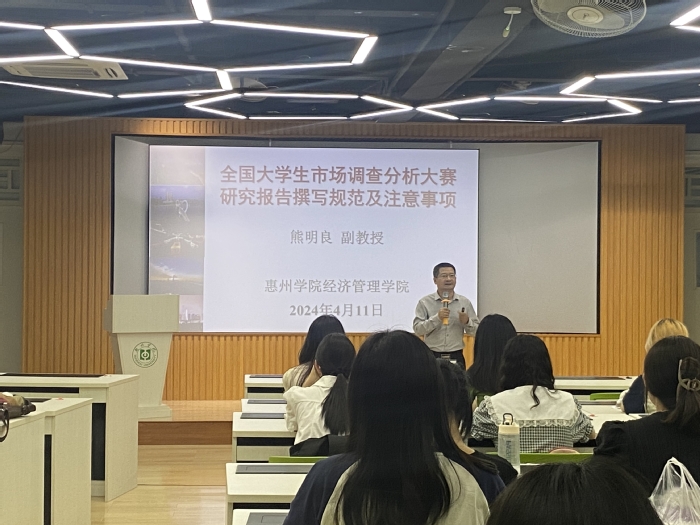 熊明良全面讲述了创新创业作品的撰写规范,包括素材选取、概要撰写、作品框架、数据分析与研究结论相符及注意事项。他的讲述生动形象、旁征博引、内涵丰富,学生受益匪浅。同时他还强调学院的宗旨是秉持在学科竞赛中获得真知,通过比赛不断提升学生的综合素质,也为推动我院高质量创新性发展作贡献。