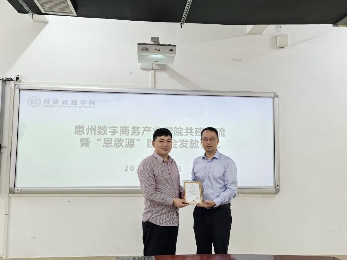 本网讯 近日,惠州数字商务产业学院共建交流暨“恩歌源”助学金发放仪式在旭日科技大楼B座1508会议室举行,我院校友、深圳市恩歌源执行总裁李长兴、深圳华商教育投资有限公司总经理曾彤,学院党总支书记史楠、副院长郭萍、刘春梅、院党总支副书记陶蓉,班主任袁祥勇等一行参加活动,仪式由陶蓉主持。