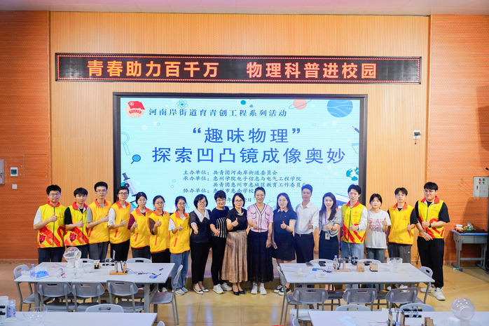 本网讯 少年强则科技强,科技强则中国强。为进一步提升青少年的科学素养,激发青少年探索科学的兴趣,培育青少年科技创新意识和探索实践能力。学院联合河南岸街道团工委、惠城区教育局在惠南学校共同开展“青春助力百千万,物理科普进校园”活动,活动主题为“趣味物理”之探索凹凸镜成像奥秘。