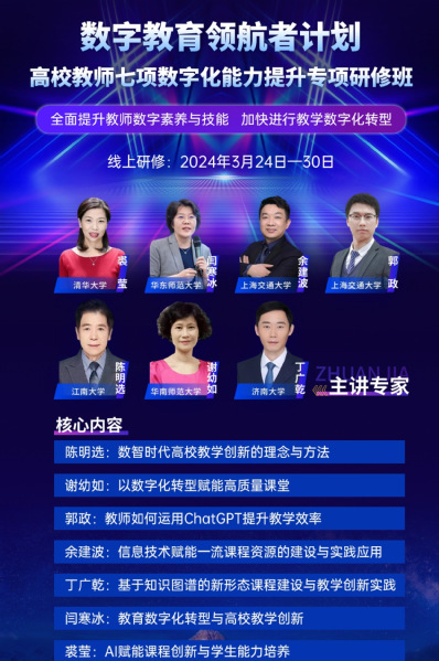 本次培训旨在将数字技术与教育教学深度融合,提升高校教师的“七项”数字素养,推动高等教育教学数字化转型、智能升级、融合创新。研修与相关单位合作邀请了来自清华大学、华南师范大学、华东师范大学等七位数字化专家,围绕数字化转型的数字教学、教学课堂、数字技术、教学应用、数字图谱、数字创新及数字赋能七个方面进行了专题培训。