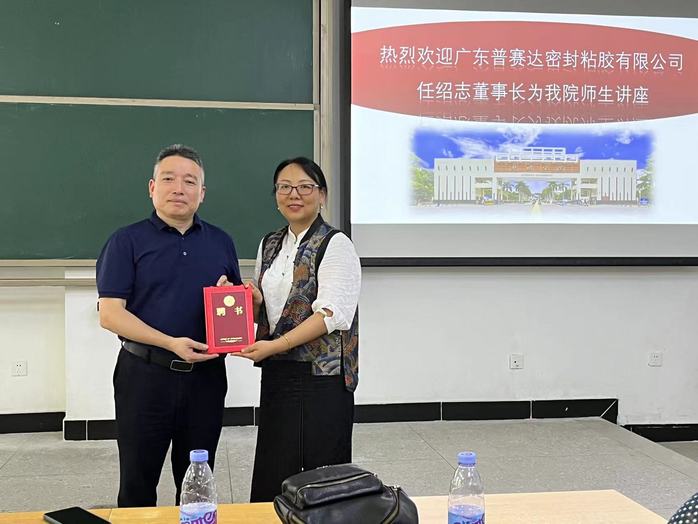 讲座结束后,封科军代表学院向任绍志颁发了化学与材料工程学院校外兼职副教授聘书。同时普赛达密封粘胶有限公司的人事负责人也借此机会向在场学生介绍了公司的暑期实习计划,希望更多学生的加入让双方的合作更进一步。
