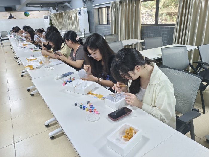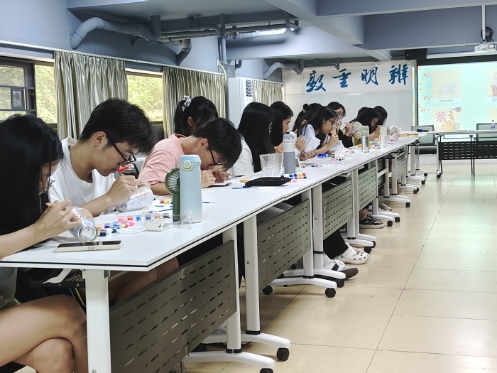 活动中,学生干部陈文怡、陆丽霞对制作流程进行详细讲解后,参与的同学纷纷拿起手中的材料,全情投入到绘画中,充分展示了大学生的想象力和创造力。每一位同学都根据自己的审美和想法,勾勒出自己心中的图案。有的画上翩翩起舞的蝴蝶,有的则是细腻的花朵,还有的描绘出可爱的动物或者卡通形象,创作出一幅幅独一无二的玻璃绘画作品。
