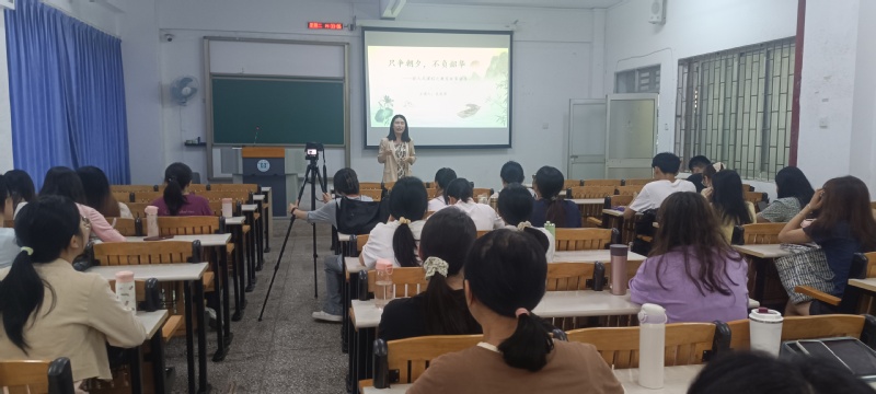 本网讯 2024年5月21日,文艺学与外国文学教研室在旭日楼219课室开展嵌入式教学活动。本次活动以“只争朝夕,不负韶华——嵌入式课程之教育故事分享”为主题,特邀惠兴小学副校长吴惠萍作为主讲嘉宾,为在座学子们讲述教师职业发展的点点滴滴。