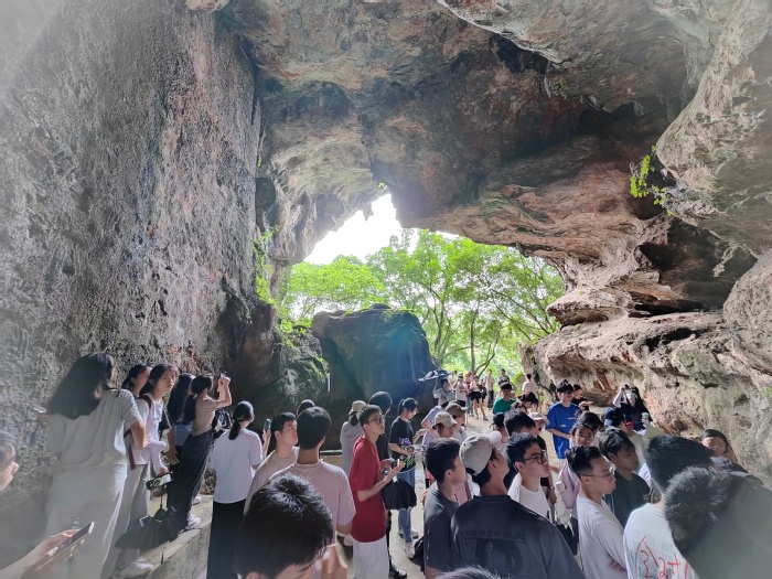 在马坝人遗址公园,师生们考察了喀斯特地貌,了解石灰岩特征、断裂、溶洞、落水洞、石芽、溶洞等成因。在马坝人遗址公园,董超阁向学生们详细讲解了马坝人遗址中岩石的种类、形成原因及其特点。在老师们的引导和解说下,学生们实地考察了马坝人曾经居住的地点——溶洞,并了解了溶洞成因。溶洞是由可溶性岩石在水的作用下溶解形成的洞穴,通常位于地下水位较高的地带,其延伸方向与地下河流向相同,呈现水平状态。