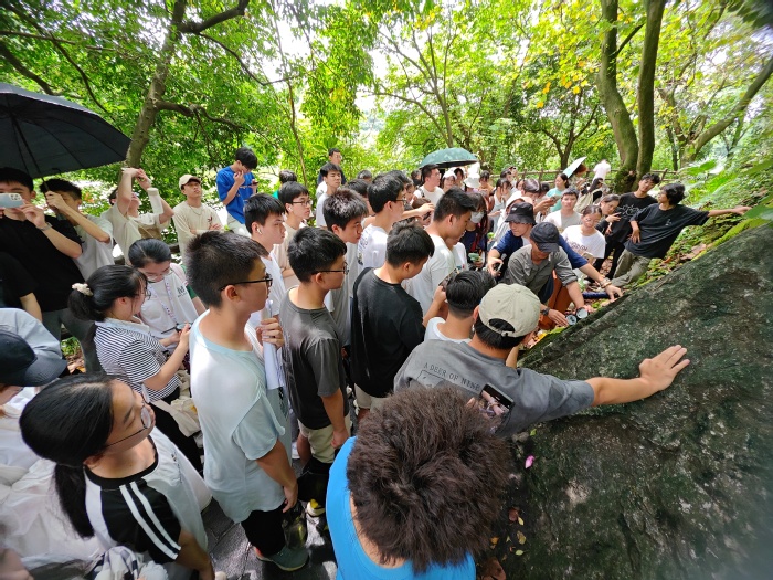 在丹霞山景区,董超阁为学生们讲解了丹霞山岩石组成、地质构造,以及丹霞山地貌成因。丹霞山地貌发育在一大向斜盆地中,地区地层为白垩系,主要由红色砂岩、砾岩等组成,岩石水平层理发育,竖直节理发育,由于地壳运动,丹霞山地区被抬升,在流水侵蚀、风化作用及重力作用下,形成类型各异的地貌,比如石柱、石墙、峡谷、石桥、石穴等地貌。