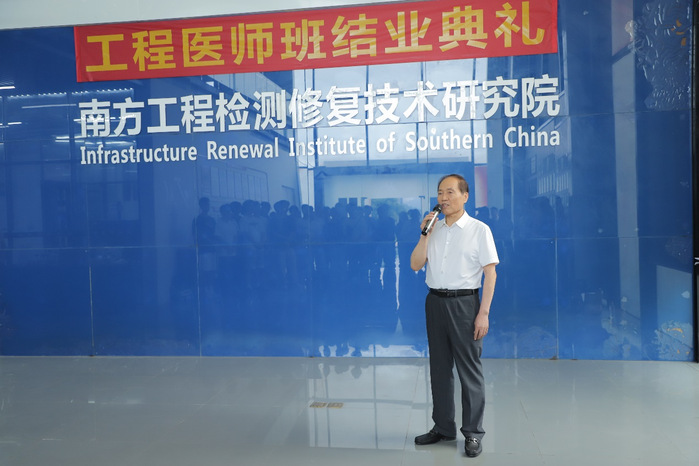 王复明院士为全体学员颁发了结业证书,并对通过考核的39名学员表示祝贺。王院士简要回顾了“工程医师特色班”的创办初衷及发展历程,表示惠州学院“工程医师特色班”是全国首例,至今已开办5届,勉励学员们积极思考、积极反馈,加强学习实践,提升专业素养,努力成为一名真正的工程医师,为中国的基建事业贡献力量,同时也对工程医师班的教学模式、课程改革提出了指引。