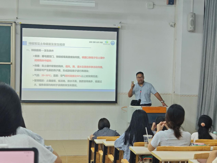 课上,陈猛博士向同学们介绍什么是微生物?微生物与植物和土壤的关系、土传病害发生原因、辣椒常见土传病害及发生规律、微生物的生防机理及特点等内容,让同学们更深入了解微生物以及有益微生物在生物防治中的应用。此外,陈猛博士对创业方面的知识与同学们进行了交流,从创业方向、商业模式、团队、资金、依托平台等角度进行了介绍,并强调打造企业核心价值的重要性,向同学们展示了博沃特生物技术有限公司获得的多项省市级创新创业奖以及不同的产业化产品。