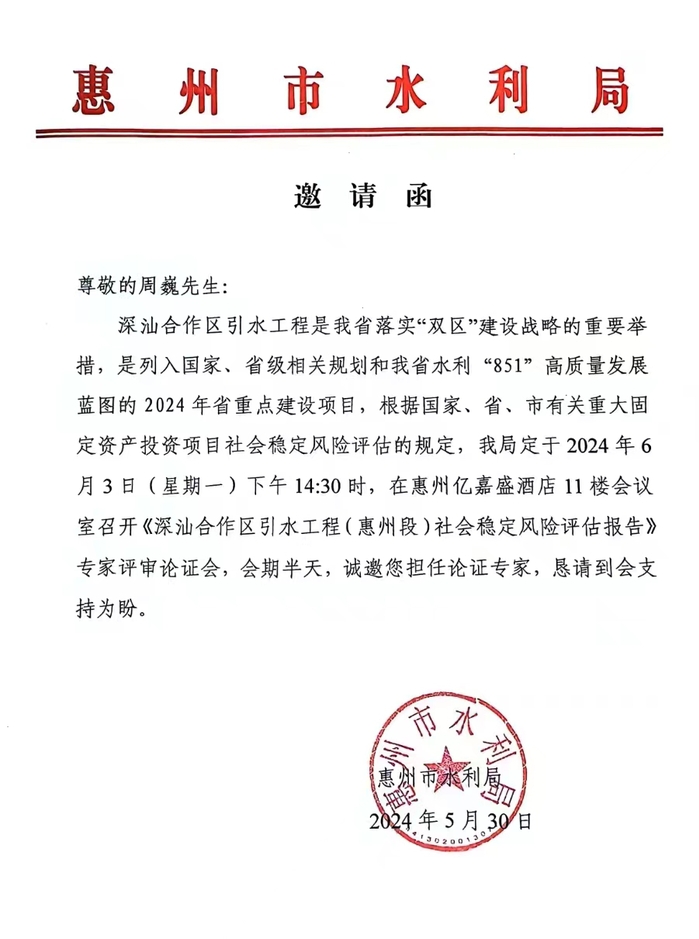 本网讯 2024年6月3日,惠州市水利局在惠州亿嘉盛酒店会议室召开《深汕合作区引水工程(惠州段)社会稳定风险评估报告》专家评审论证会,我院周巍博士作为论证专家受邀参加会议。