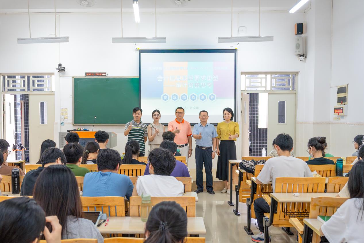 许文建为学生提供了与行业前沿接轨的学习体验。他分别从审计与会计的区别与联系、结构化思维在审计实务中的运用、会计信息质量要求的重塑、适应新时代和新业态的审计技能要求思考四个方面进行讲述。