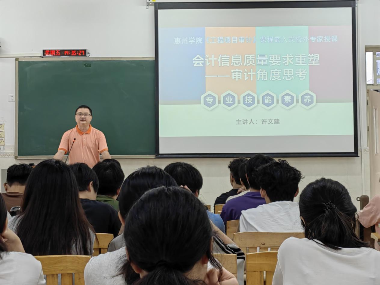 本网讯 为更好地建设省一流课程《工程项目审计》,让学生获得更多的新知识,5月31日下午,学院邀请亚会财税研究院院长许文建教授进行专家嵌入式课堂,主题为《会计信息质量要求重塑——审计角度思考》。活动由副院长、《工程项目审计》课程负责人熊明良博士主持,院党委副书记陶蓉、审计学系主任王江、审计学系汪洋老师以及审计学专业100多名学生参加。