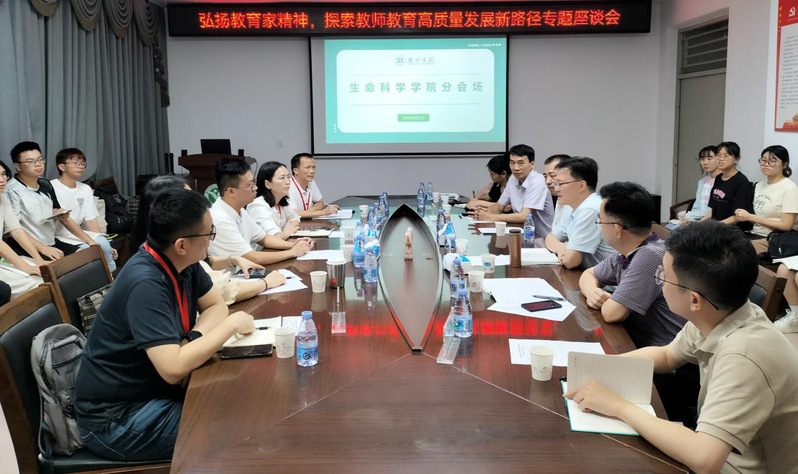 本网讯 为大力弘扬教育家精神,推进“双进双培”教师教育一体化,助推基础教育高质量发展,6月4日晚,我校召开“弘扬教育家精神,探索教师教育高质量发展新路径”专题座谈会,生命科学学院在学院E409会议室设立分会场,惠州市初中校长任职资格培训班学员,院党委书记杨敏、院长周立斌、副院长林芳花,生物科学系主任吴小明、副主任黄徐丰,教师代表王国莉老师以及生物科学专业学生代表参加会议,会议由周立斌院长主持。