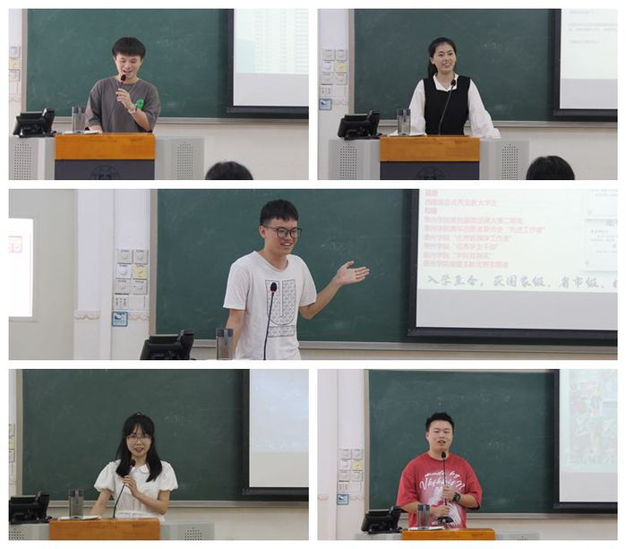 优秀学生代表黄树韬、张泽纯、纪家慧、陈嘉诚和电子信息与电气工程学院优秀学生代表葛爱迪分别分享了他们的经历和见解。黄树韬强调了思维导图在学习中的作用,并鼓励学生们拓宽视野,积极参与实习和实践活动。张泽纯分享了她的比赛经历,鼓励学生们积极参与赛事和志愿活动,拓宽人生视野。纪家慧鼓励学生们积极参与学校活动,勇于尝试新鲜事物。陈嘉诚分享了他在学习和部门工作之间的平衡,以及他支教的经历。葛爱迪则分享了时间规划的重要性,鼓励学生们制定计划,关注国家政策。