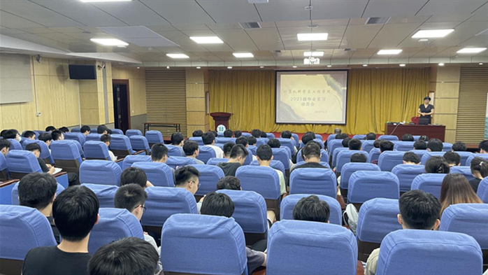 本网讯 实习是人才培养方案的重要组成部分,为进一步做好我院2021级学生实习工作,加强学生职业规划,抢抓就业机遇,6月16日晚上,我院在图书馆报告厅召开2021级实习动员大会。副院长张晓欢,辅导员肖经聪、刘金鹏及2021级全体学生参加大会。