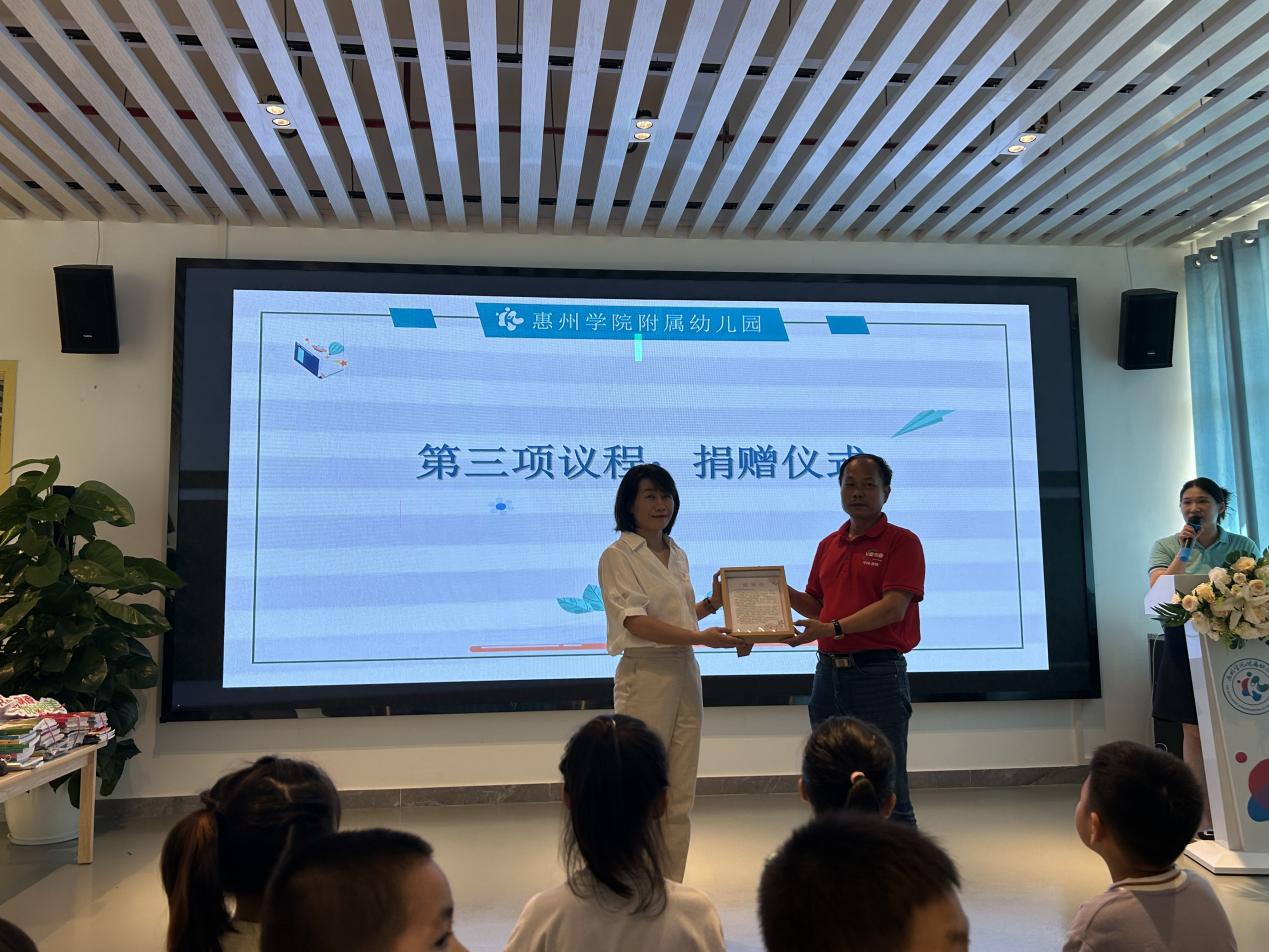在教育科学学院主持行政工作副院长、惠州学院附属幼儿园法人代表谢桂新教授等师生的共同见证下,该园党支部书记、执行园长林海娟代表接受了捐赠。