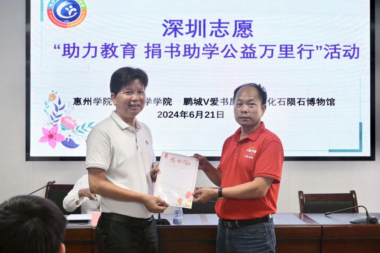 本网讯 “书籍是人类进步的阶梯。”为推广儿童阅读和科普,开阔学生视野,6月21日,教育科学学院联合鹏城V爱书屋、深圳化石陨石博物馆赴博罗县观音阁中心小学、惠州学院附属幼儿园开展“助力教育 捐书助学公益万里行”活动。教育科学学院相关领导,鹏城V爱书屋负责人程杰华、深圳化石陨石博物馆馆长段维等出席了活动。