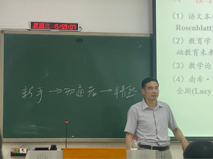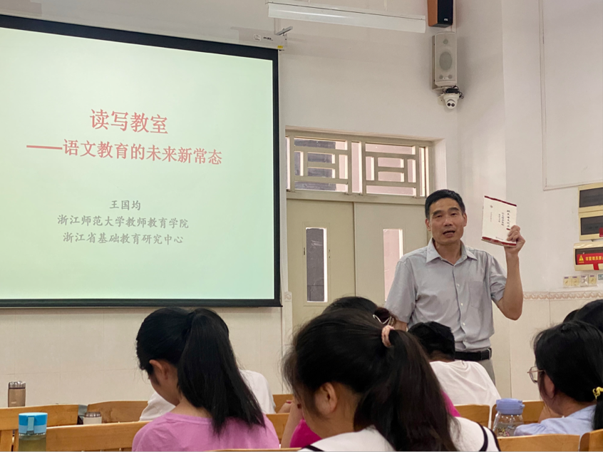 本网讯 6月19日下午,由教育科学学院承办的丰湖教育论坛系列讲座在旭日科技大楼B座305教室举行,本次讲座主题为“读写教室:语文教育的未来新常态”,由来自浙江师范大学教师教育学院王国均副教授主讲,教育科学学院学科带头人陈伟教授主持,副院长王贤文、小学教育系专业教师、学生代表等参加讲座。