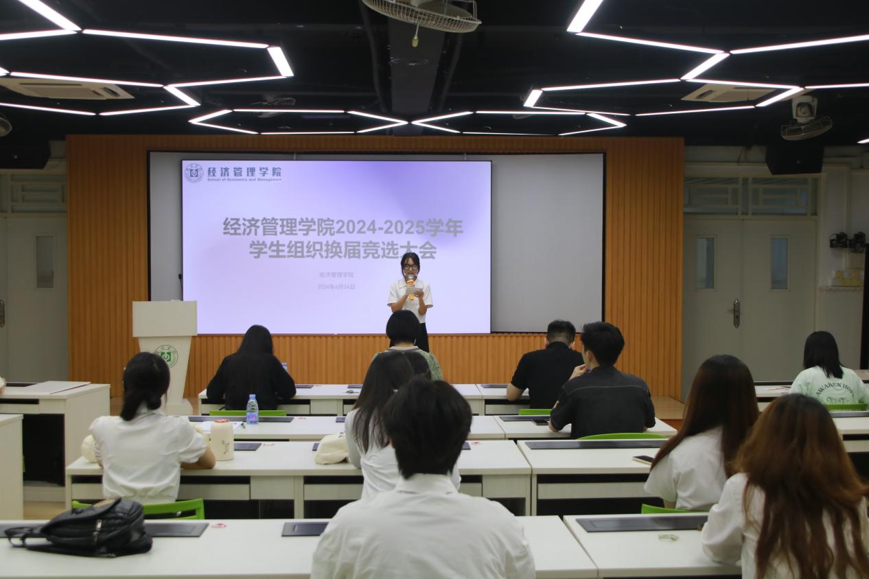 本次换届大会以经济管理学院团委、学生会、新闻中心、科创中心、党务服务中心等主要学生骨干竞选为主。本次学生骨干竞选共有24位候选人,候选人按抽签顺序进行竞选演讲和问题答辩。候选者们迈着坚定的步伐走上演讲台,目光炯炯,神情自信。在竞选演说中,他们声情并茂地讲述着自身经历、优势和未来规划,在答辩环节,他们逻辑严密,从不同角度深入剖析问题,有条不紊地阐述自己的见解,言语间尽显自信与沉稳,充分展现了他们优秀的思维能力和应变能力。