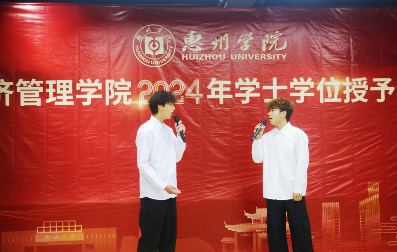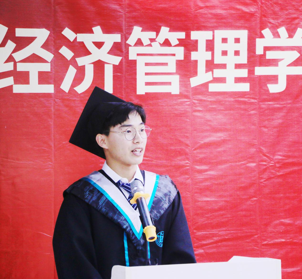 2020级审计学1班罗志鉴同学作为毕业生代表发言,他代表2024届毕业生向母校和老师致以崇高敬意和衷心感谢,四年的大学生活如一幅多彩画卷,记录了成长足迹,也留下了青春印记,今后将带着母校给与的力量,踏上人生新征程,共同汇聚出实现中华民族伟大复兴的青春力量。
