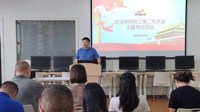 本网讯 为庆祝中国共产党成立103周年,继承和弘扬党的光荣传统和优良作风,不断深入推进党纪学习教育,6月26日下午,政法学院教工第二党支部在旭日科技大楼B座1601开展了“庆七一·学党纪·迎华诞·谱新篇”主题党日活动。政法学院党委书记曾蔚阳出席活动,教工第二党支部全体党员参加活动,活动由党支部书记李博强主持。